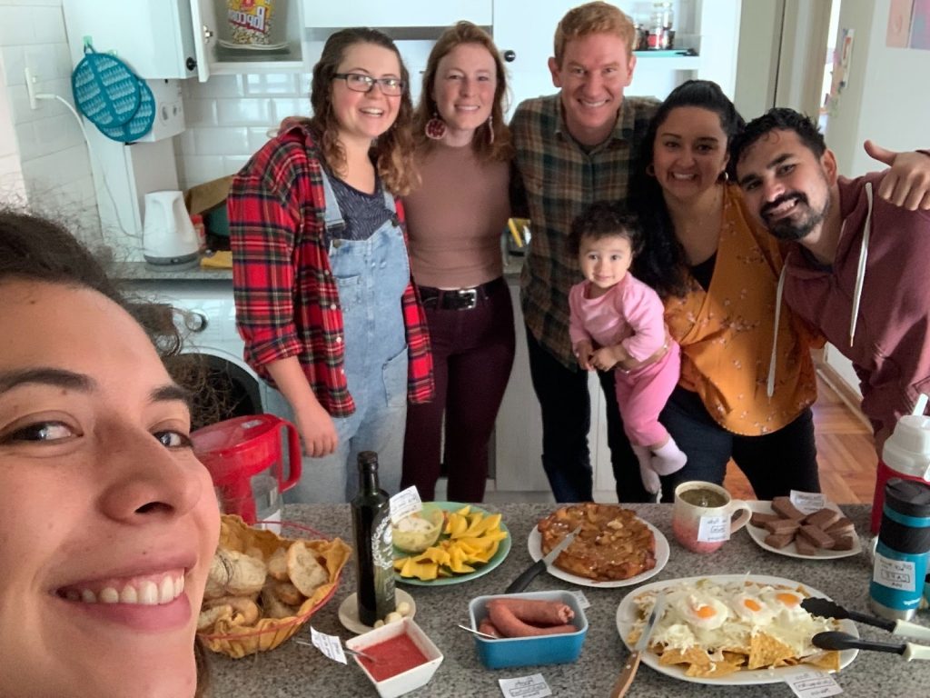 Yo, Mary, Isa, Greg, Lydi, Eli y Koke comiendo desayunos de diferentes paises.